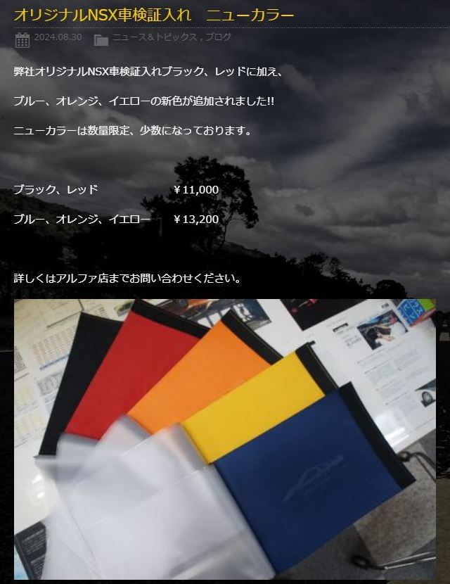 2018年にNSX DAYS事務局が企画販売した「NSXオーナーズクラブ別注車検証入れ」。 全10種のうち3種を購入したのだが、この車検証入れを、NSXを中心とした東京のスポーツカーショップである「ヨコオオートモービル」さんがオリジナルグッズとして販売しているという情報をホンダ仲間のN君から得て一緒に購入することに。 公式サイトを見てもいつから販売されていたのか不明だったが、元々NSXシルエット入りのタイプE(表黒スエード・裏赤スエード)のみを1万円で販売開始、その後、両面が黒スエードのタイプFを追加し、そして2024年8月末にオーナーズクラブ仕様では存在していなかった、裏地がブルー、オレンジ、イエローのスエードバージョン3種をそれぞれ13,200円で追加したようである。 現在は5種すべてを1万円均一で販売中で、私は未入手の3カラーを注文し、2025年8月26日に入手した。 |