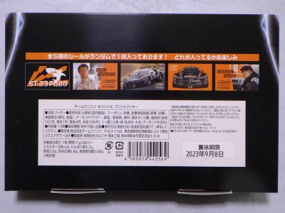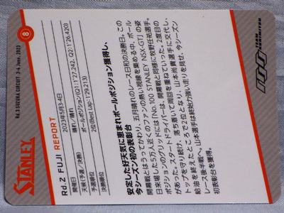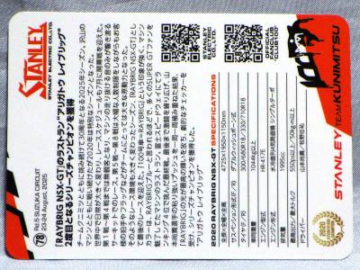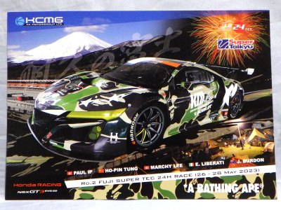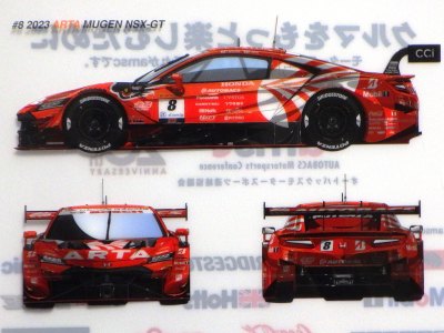 2023年4月入手。 いつもGTグッズでお世話になっている大阪のS氏に頂いたスーパーGT2023開幕戦の土産の一つ。 サイズは10.5×14.8cm。 ステッカーのように4カ所をくり抜いて使用することができるようになっている。 |