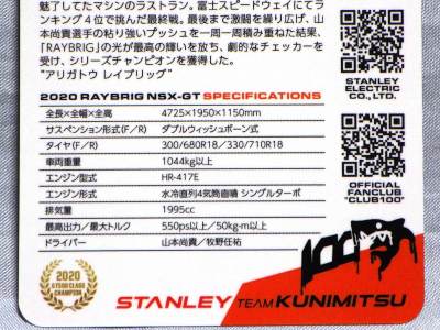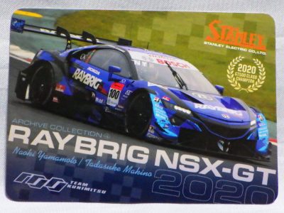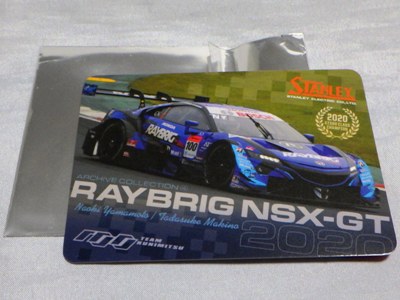 2020年12月ヤフオクにて入手。 2020年11月28〜29日にFUJIで開催されたスーパーGT最終戦(第8戦)で配布されたもの。 山本尚貴選手と牧野任祐選手のドライビングによりレイブリックNSX-GTは最終戦で初優勝し、見事シリーズチャンピオンに輝いた。 ビニール袋の中で保護用の紙に包まれているためデザインが見にくいが、あえて未開封で残してある。 サイズはかなり小さめで11.5×15.0cm。 |