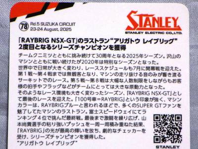 2023年7月31日17時からauto sport web shopにて販売開始。 8月3日に注文し8月5日に届く。 スタンレーNSX-GTのフロントビューがデザインされた正真正銘のNSXグッズ。 2か月前に発売された「HRCスーパーGTパスケース」のサイズは22×11cmと大きめだったが、この商品はさらに大きい24×11cm(パスケース部分のみ)。 |