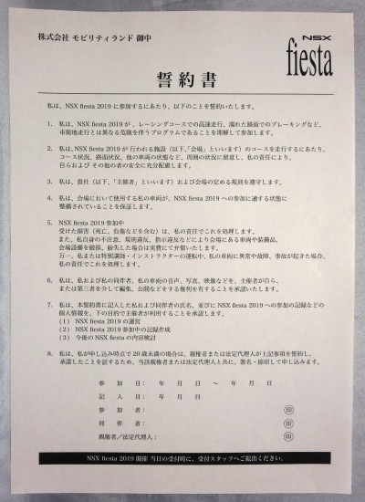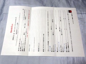 2016年5月14日、ツインリンクもてぎで有志によって開催されたイベントで使用されたもの。案内状、入場パス、集合場所マップ、参加承諾書と共に参加者に送付された。サイズはA4。グレード、型式、年式、カラー、」ナンバー等の車両データのほか、「愛車のココが◎」「今後、愛車のココをなんとかしたい」「愛車購入のキッカケ」「今後、ホンダスタイルの記事で望みたい内容」「チューニングの内容」を記すもので、エンジン系(マフラー・エキマニ・エアクリーナー・ECU・その他」)、サスペンション(ショック・スプリング)、ボディ&エアロパーツ(フロントまわり・リアまわり・ボンネット・サイドステップ・サイドミラー)、タイヤ&ホイール(タイヤ銘柄&サイズ・ホイール銘柄&サイズ)等、かなり詳細を聞く内容。6月20日発売号に掲載された。 | ||