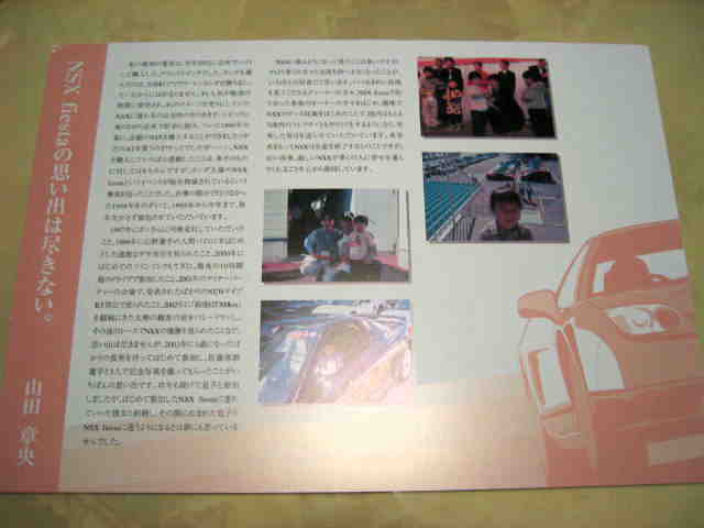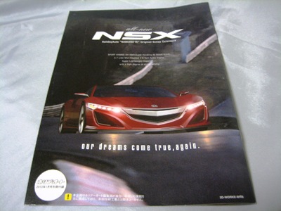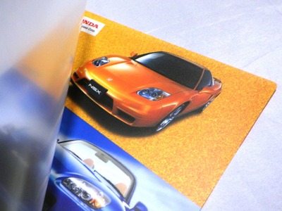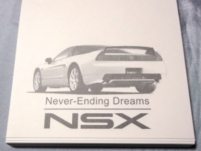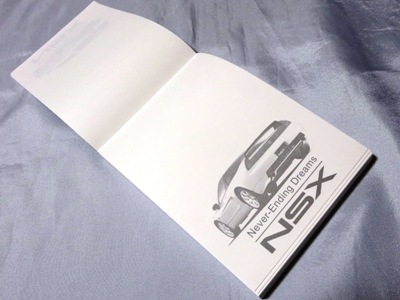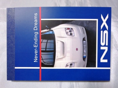 | 2014年11月ヤフオクにて入手。NSXデビュー当時にホンダベルノ道央が製作した。タイトルは「新しき鼓動の始まり」。中身は普通の写真アルバムでオーナーが自由に愛車の写真を収めていくというもの。 | |||