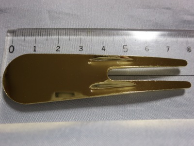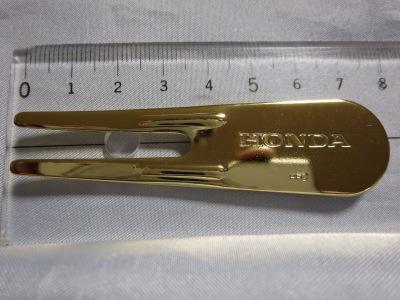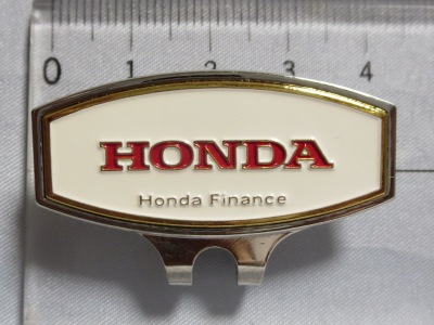 2018年6月ヤフオクにて入手。ホンダファイナンスの主催したゴルフコンペか何かの賞品と思われるが詳細は不明。 もっともスタンダードなマグネット式で、帽子のつばに装着する金属製の台座と、裏面に強力な磁石が埋め込まれたNSX-Rロゴ入りのマーカー、そしてグリーン上にピッチマーク(ボール跡)が付いたときにそれを修復するためのリペアフォークの3点セット。 帽子をかぶらないプレーヤーはリペアフォークにマーカーを貼り付けてポケットに入れて持ち歩くことになる。 台座やリペアフォークの方にマグネットが埋め込まれている方が一般的らしい。 |