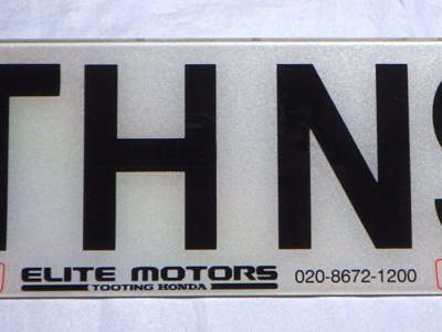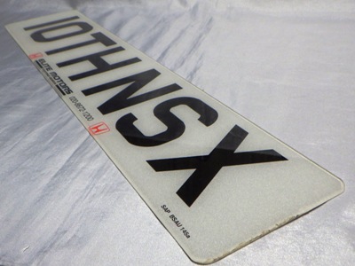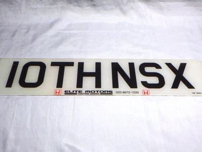 2024年3月に4月6日にヤフオクに初登場したイギリスのナンバープレートを入手。 「10TH NSX」という文字からも分かるように、2000年に発売10周年を迎えたNSXを記念して、イギリスのディーラーが販促品かイベント用に制作したものと思われる。 「ELITE MOTORS」はロンドンに存在したホンダのディーラーのようだが(同名のカーショップは日本も含め世界中にある)、ネットでは 僅かしか情報が見つからなかったので、現在は統廃合でなくなってしまっているのではないかと思われる。 サイズは110×520×3mm。 |