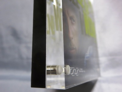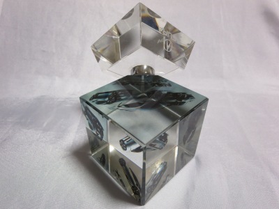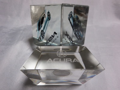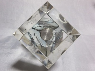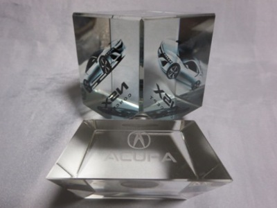 2019年6月6日ヤフオク初登場。 アキュラディーラーかモーターショーなどのイベント会場で関係者に配布されたものか。 下部の台座の1辺は6.5cm、上部のキューブの1辺は6.0cm、高さは12.5cm。 下向きの3面に反転印刷された画像入りシートが貼られており、上向きの3面から、それらが正しく見えるデザインになっている。 思っていた以上に高級感があり、キューブ部分は抵抗なく回転する。 |