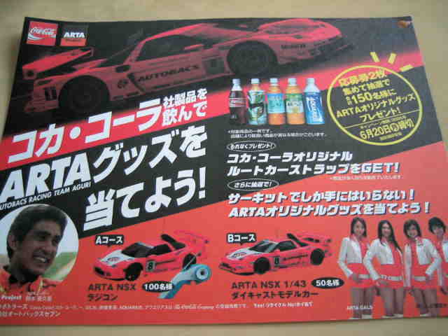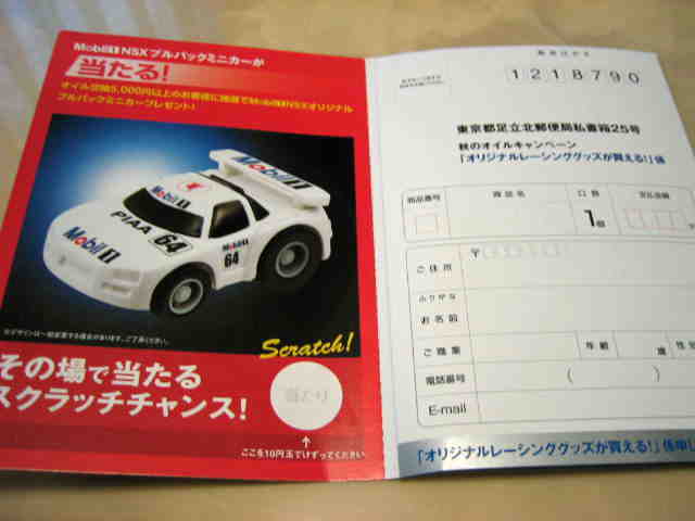 | 2014年10月コレクター仲間から譲っていただいたもの。PIT-PROはARTA NSXのスポンサーの1つである日本オイルサービス株式会社のカーメンテナンスブランド。このクッション自体にNSXはデザインされていないが、NSXがプリントされたプレゼントキャンペーンくじが付属 。 | |||