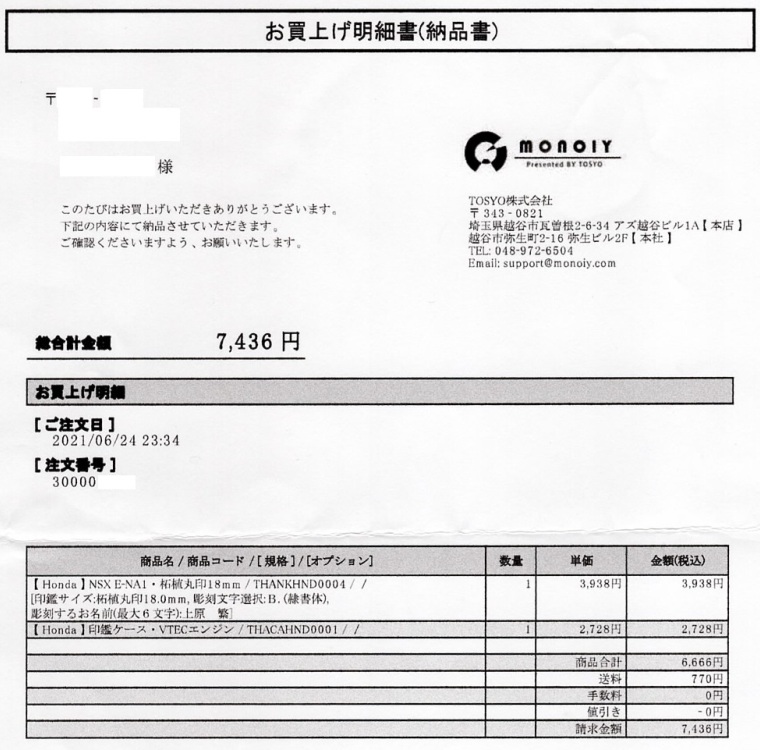 2021年6月24日の発売と同時に注文したが、丸々2か月かかって8月24日に到着した。NSX印鑑とVTECエンジン印鑑ケースを注文したが、エンジンはNSX用をデザインしたものではないので、グッズ数にはカウントしていない。 |