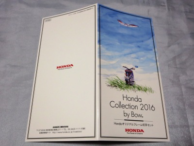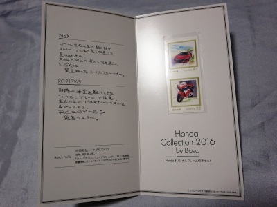 2016年12月ヤフオクにて入手。11月29日に、ホンダの株主優待品として株主に送られたものが一斉にヤフオクに出品された。台紙と切手のイラストは、イラストレーターのBow。氏こと池田和弘氏の作品。新型NSXとRC213V-Sを描いた52円切手が1枚ずつ収められている。 2ツ折りにした時の台紙のサイズは198×100mm。切手のサイズは37×32mm。ほとんどが1,000円以下での出品ばかりで、安いものは200〜300円くらいからあり、送料無料の出品も多数あったため、過去の株主優待トミカ等と比べると比較的購入は容易であった。 ちなみに2016年12月7日21時現在のヤフオクでの落札数は33点、出品中の数は61点(当サイト調べ)。 |
