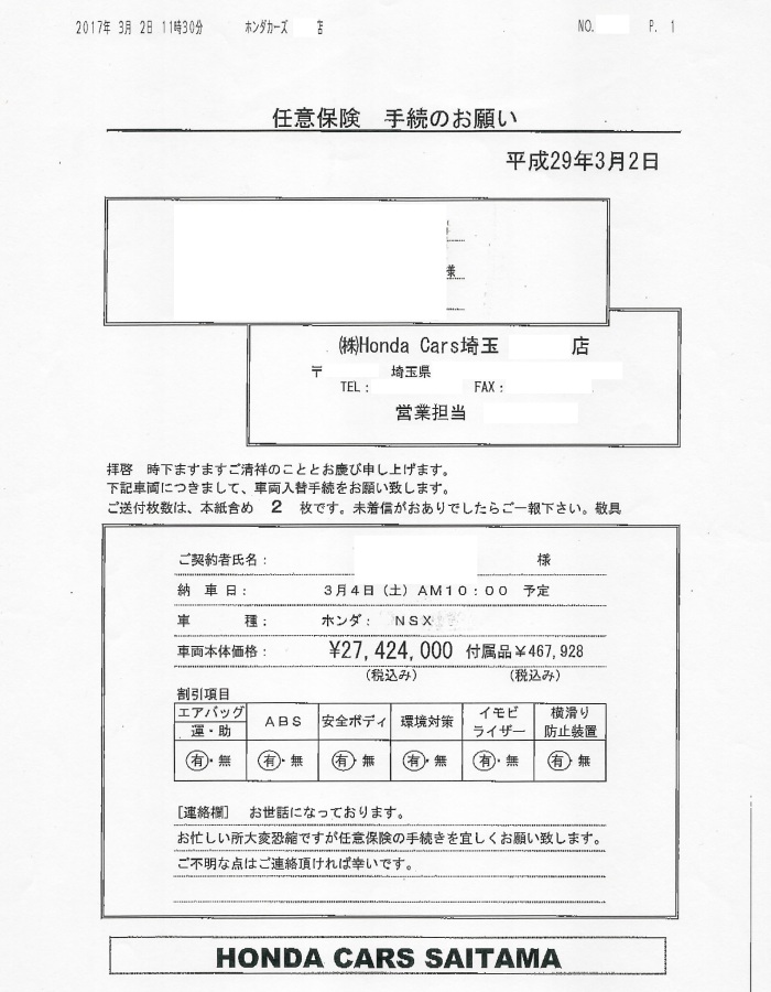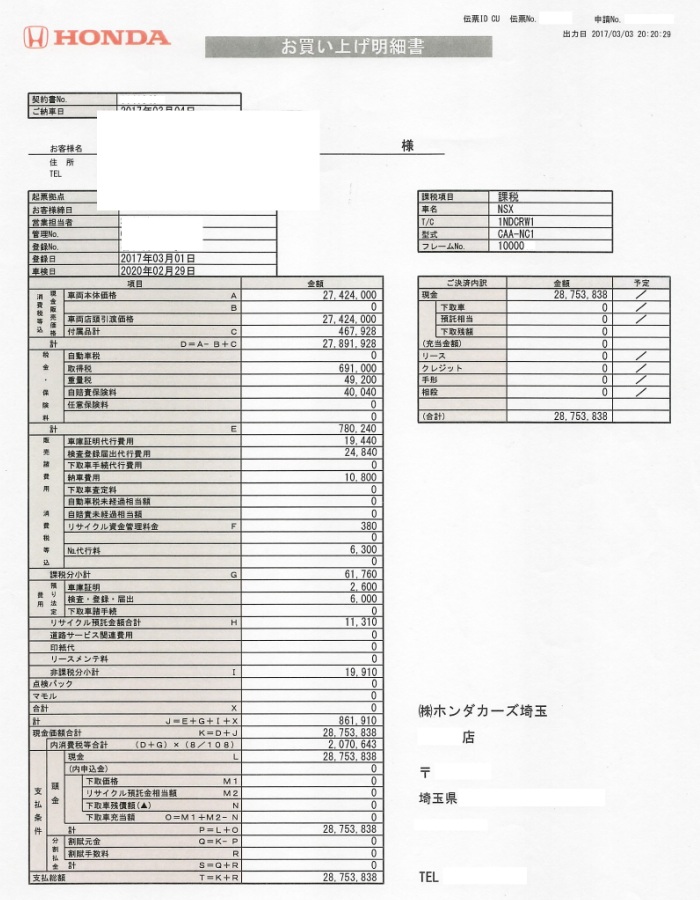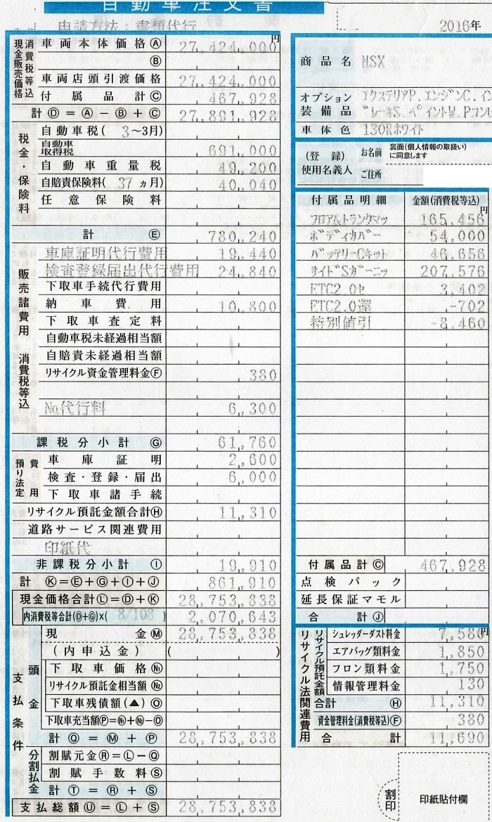 本来は、様々なNSX関連の書類も掲載している「カタログ・書籍」コーナーに掲載すべきものだと思われるが、2024年10月8日にヤフオクに出品され、落札できた「車検証入れ」とセットで同じ出品者の方から入手したものなので、ここに掲載しておく。 NC1を新車で購入したときのもので、支払総額は普通に家が買える「28,753,838円」という金額になっている。 付属品だけで467,928円と低年式の中古車が買える価格だが、なぜそんなに高いのかと明細を見ると「サイドS(ステップ?)ガーニッシュ207,576円」「フロア&トランクマット165,456円」「ボディカバー54,000円」というように恐ろしい数字が並んでいる。 付属品には8,460円の特別値引が記載されているが、車両本体には値引はなさそう。 消費税だけで2,070,643円が計上されている(この方の購入時期は2016〜2017年で消費税が8%だった時代。ちなみに10%になったのは2019年10月。)。 私がNA1を中古で購入した1995年は、まだ3%の時代。 1997年から5%に上がることが分かっていたので、それまでには買わないと!と必死になっていたが、それがかわいく思える金額。 私が当時ビビリながら払った消費税は、この方の10分の1以下だった。 |