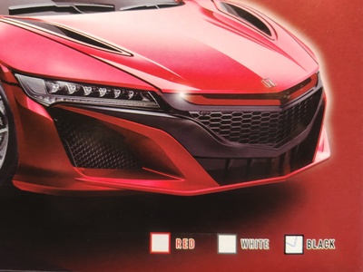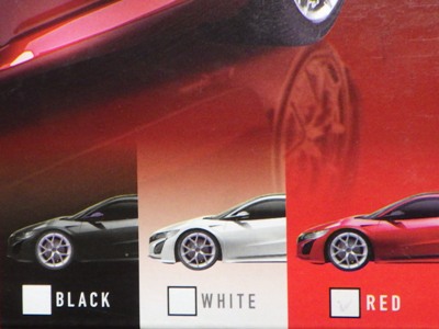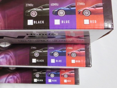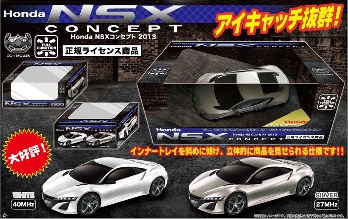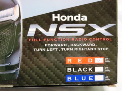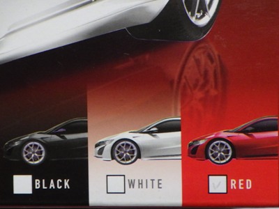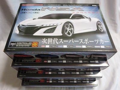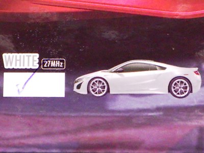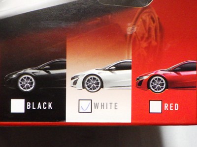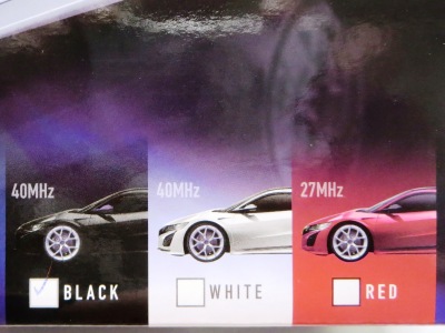 2017年7月13日にヤフオクに初登場(7月24日には新バージョンのパッケージが早くも登場。パッケージサイズは最近定番化しつつある薄型ボックスタイプ。カラー設定は、レッド、ブラック、ホワイトの3色で、周波数はレッドとブラックが27MHz、ホワイトのみ40MHz。レッドとブラックのモデルがパッケージの両面にそれぞれ描かれているが、ブラックモデルはNSXコンセプトシリーズにはなかったもので、まずはブラックのみ入手し、後にホワイトとレッドを入手してコンプ。 |
